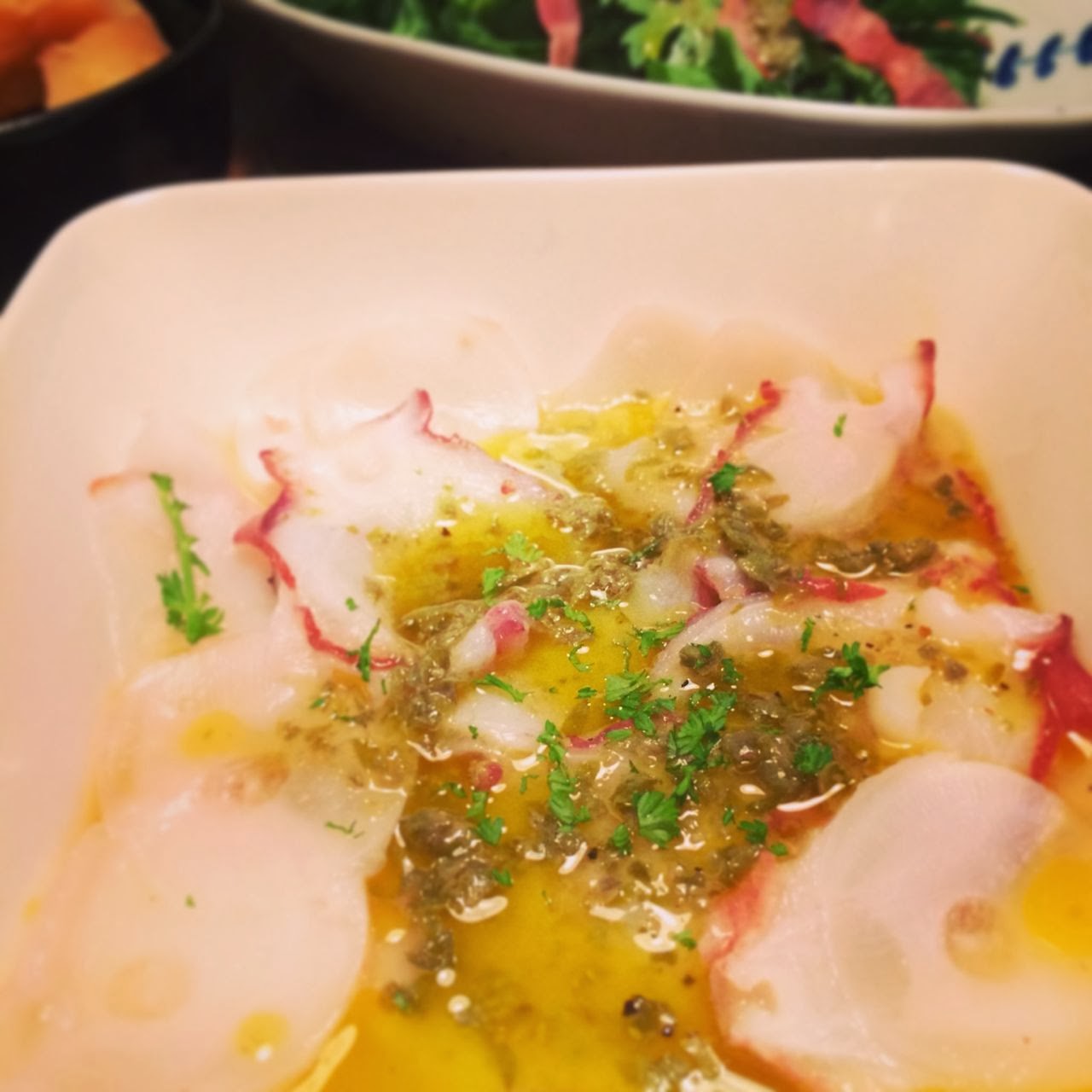パセリの代わりにならないかとカルパッチョにかけてみました。